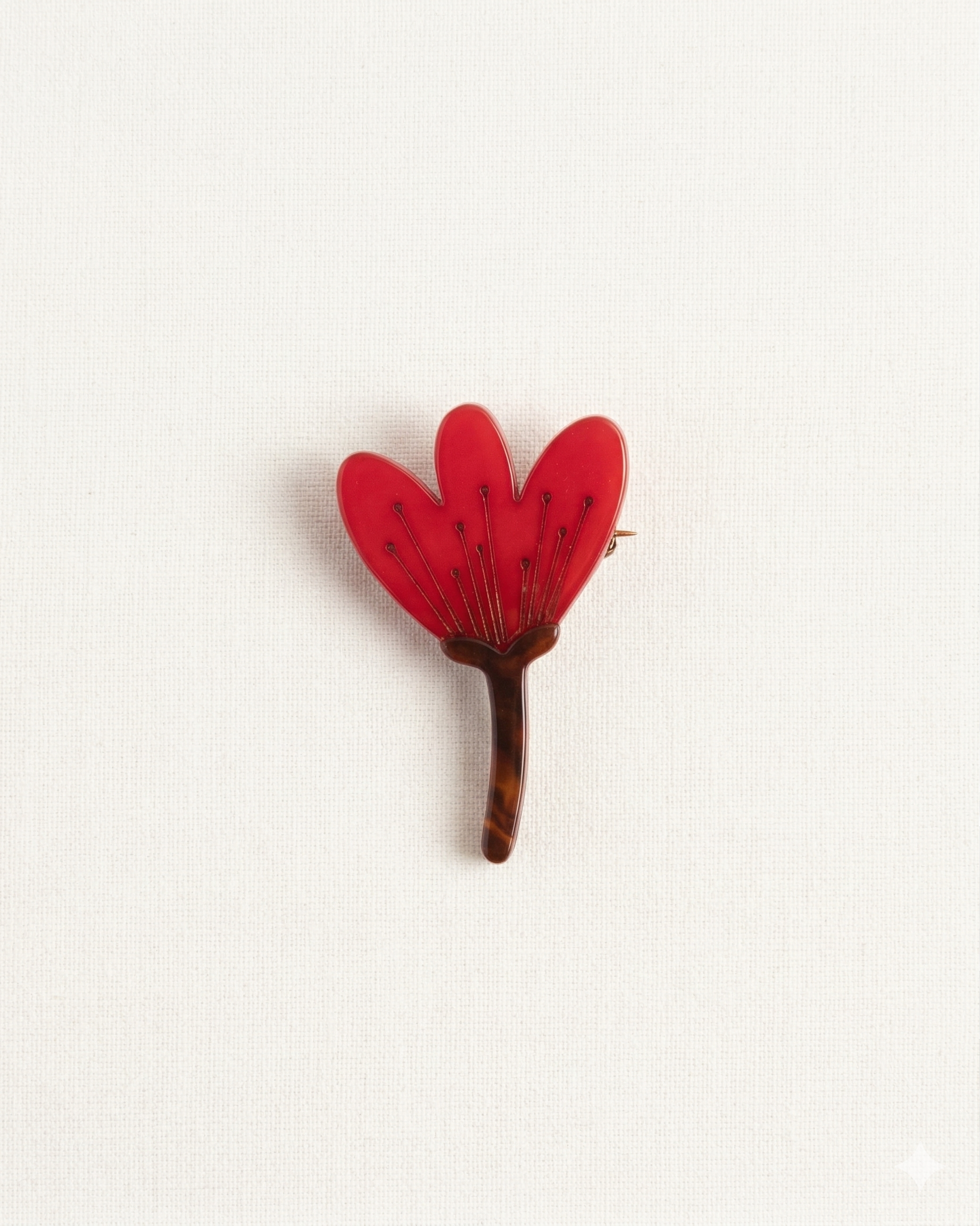 Broche con forma de tulipán en resina roja. Un detalle pequeño con mucho carácter, ideal para personalizar cualquier prenda al instante: una solapa, un escote, una bolsa o un sombrero.