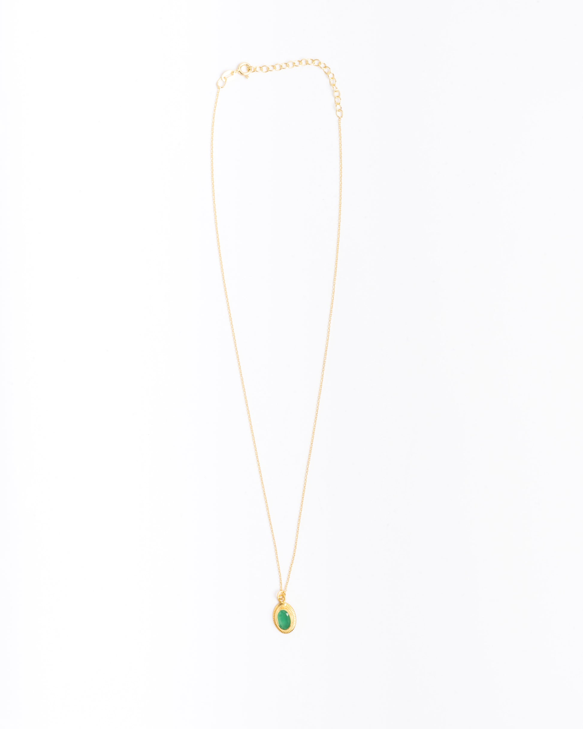 Cadena fina de plata chapada en oro con colgante de calcedonia fucsia en forma ovalada.